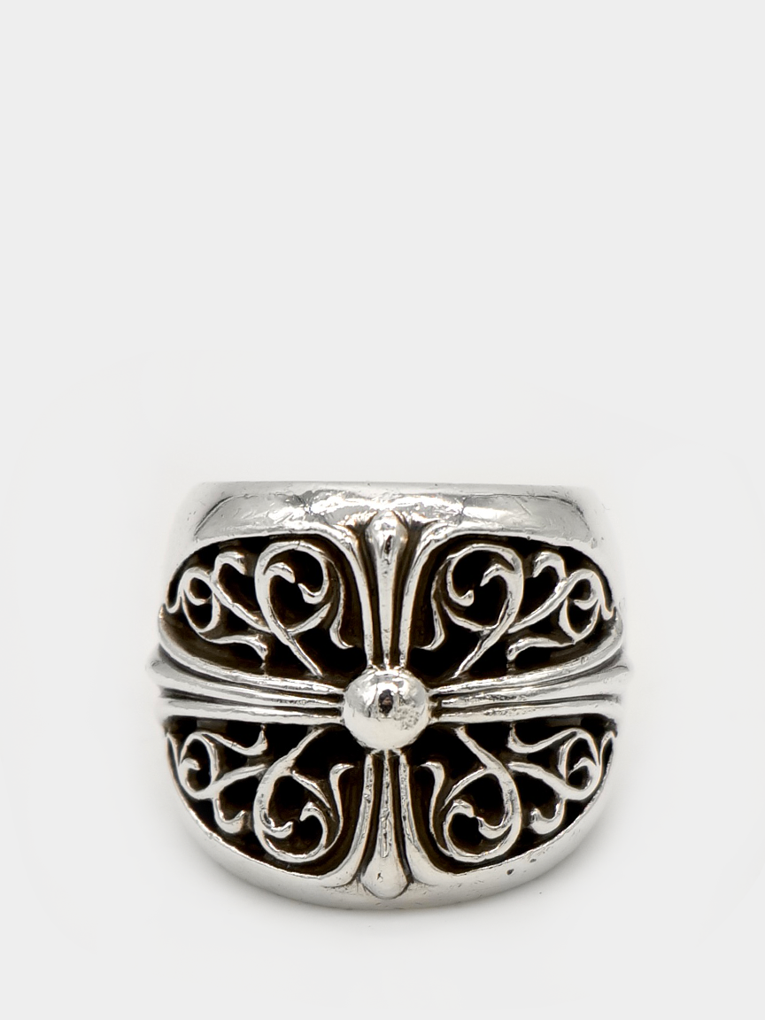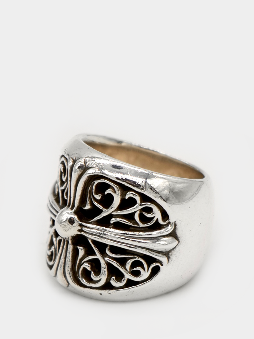The foundational model and cornerstone of the Chrome Hearts aesthetic, this ring is a silver sculpture with organic and fluid curves.